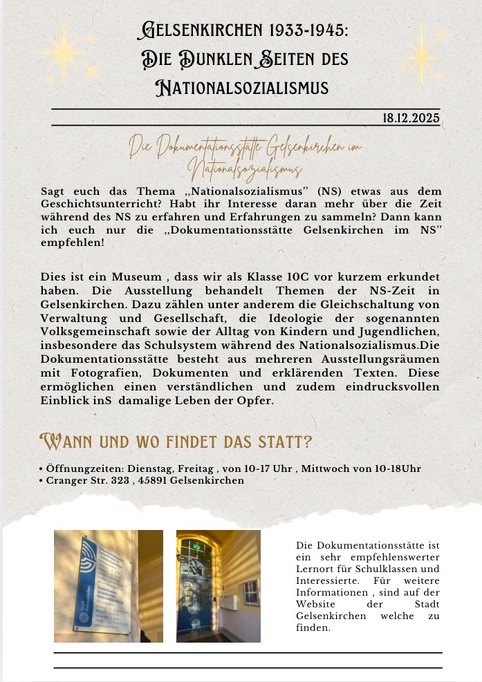 Wir haben im Rahmen des GL-Unterrichts die Dokumentationsstätte „Gelsenkirchen im Nationalsozialismus“ besucht. Dort haben wir viel über die Zeit des Nationalsozialismus gelernt und erfahren, wie diese Zeit auch das Leben der Menschen in Gelsenkirchen beeinflusst hat
