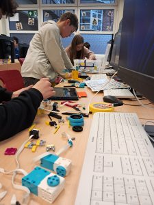 Dabei lösten die SchülerInnen verschiedene Aufgaben, bei denen zunächst kreativ mit den LEGO-Robotern und LEGO-Teilen gebaut und im Anschluss programmiert werden musste. Dazu nutzten die SchülerInnen Roboter der LEGO Mindstorms Serie, die Herr Glockner mitbrachte, sowie teilweise Roboter der Reihe Spike Prime, die der Schule gehören. Programmiert wurde mit den Apps LEGO Mindstorms Inventor und LEGO Spike Prime.